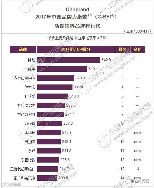 据数据统计, 从品牌力指数检测情况来看,功能饮料行业中脉动、红牛和农夫山泉尖叫分别以642.8、510.1和379.9的品牌力指数成为最热销的三大品牌。总体来看,行业的品牌认知度比较高,脉动功能饮料最受大众的喜爱!2017年度中国功能饮料品牌排行榜排名如下: