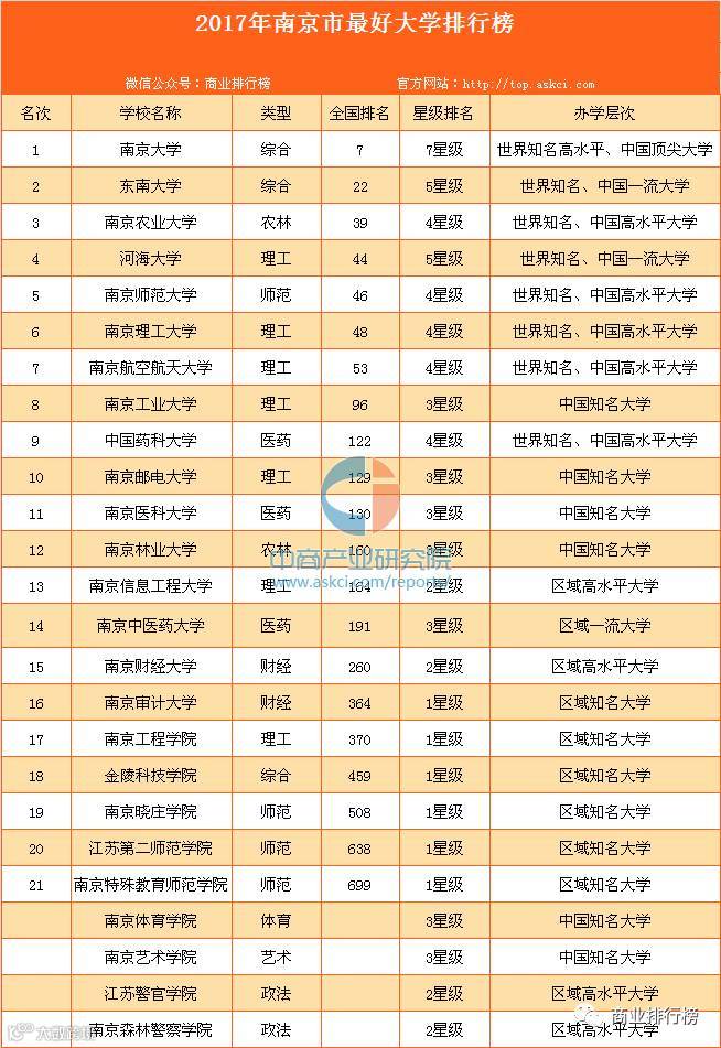 根据艾瑞深中国校友会网最新发布2017南京最好大学排行榜显示,南京大学、东南大学、南京农业大学、河海大学、南京师范大学、南京理工大学、南京航空航天大学、南京工业大学、中国药科大学、南京邮电大学雄居校友会2017南京市最好大学排行榜前10强。