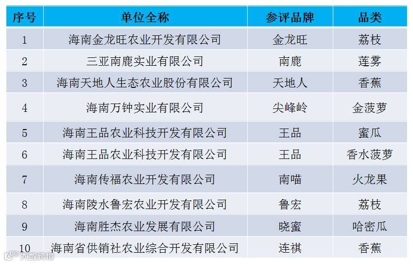 8月31日,由中国果品流通协会主办,中华全国供销合作总社、陕西省人民政府指导,陕西省果业管理局支持的第二届中国果业品牌大会在西安建国饭店会议中心盛大开幕。会上公布“2016海南热带水果十大品牌”榜单如下: