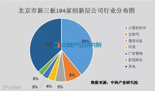 北京的184家新三板创新层公司,分布于计算机软件行业的最多,达72家,占比39%;其次是互联网行业,有16家公司,占比9%;排名第三的是通信行业,有10家公司,占比5%。这排名前三得三个行业,占据了创新层公司的半数。还有体育之窗、能量传播、开心麻花、龙腾影视、身临其境5家影视娱乐公司进入创新层。