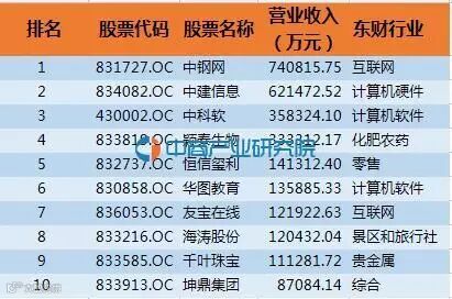 在营业收入方面,排名前十位的是中钢网、中建信息、中科软、颖泰生物、恒信玺利、华图教育、友宝在线、海涛股份、千叶珠宝、坤鼎集团。由下图可以看出,营收规模大的分布在计算机软件行业和互联网行业。可以发现,这其中有9家企业的营收规模均超过10亿元。