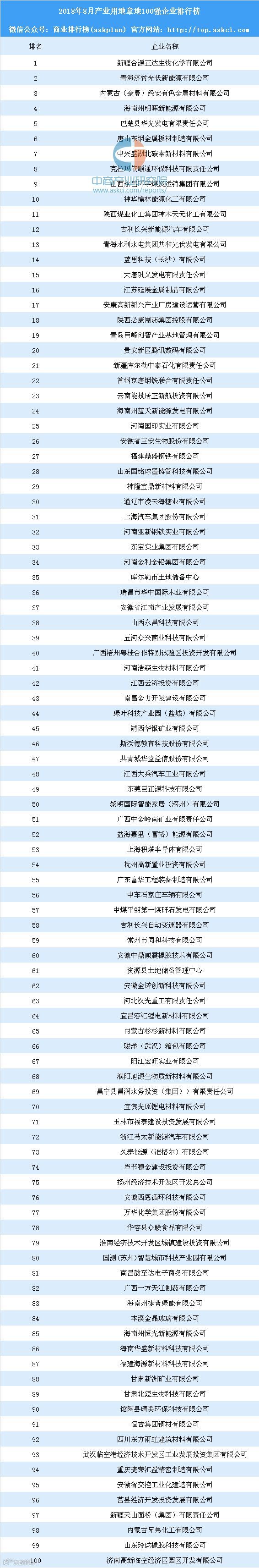 据专业的产业拿地策划规划咨询机构中商产业研究院产业地产情报库监测数据显示:2018年8月产业用地拿地100强企业前十分别为:新疆合源正达生物化学有限公司、青海济贫光伏新能源有限公司、内蒙古(奈曼)经安有色金属材料有限公司、海南州明晖新能源有限公司、巴楚县华光发电有限责任公司、唐山东钢金属板材制造有限公司、中兴盛湖北碳素新材料有限公司、克拉玛依顺通环保科技有限责任公司、山西永昌环宇煤炭运销集团有限公司、神华榆林能源化工有限公司。