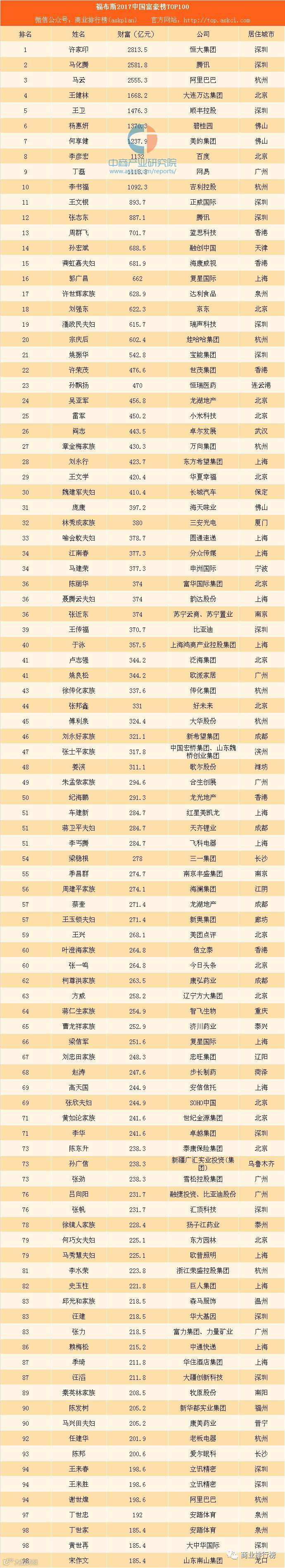 11月16日,福布斯发布2017中国富豪榜,今年的榜单有53名中国富豪榜新成员。恒大许家印在今年福布斯中国富豪榜位居榜首。许家印的财富净值从去年的656.6亿元猛增至2,813.5亿元。马化腾和马云分别以2,581.8亿元和2,555.3亿元排名第二和第三。财富涨幅较大的上榜富豪有吉利集团董事长、沃尔沃汽车所有者李书福。百度李彦宏排名仅第8名,财富1132亿元,不敌顺丰王卫。