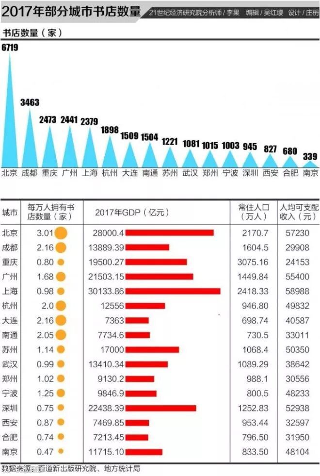 21世纪经济研究院分析师注意到,以绝对量而言,北京市以6719家书店的数量高居全国首位,成都次之,以3463家的数量居全国第二;而重庆、广州、上海分别以2473家、2441家和2379家,列三至五位。