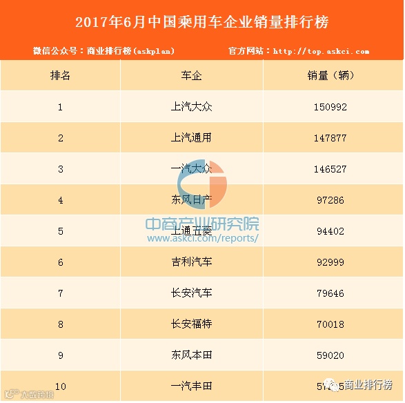 2017年6月乘用车生产企业销量前十排名依次为上汽大众、上汽通用、一汽大众、东风日产、上通五菱、吉利汽车、长安汽车、长安福特、东风本田以及一汽丰田。其中,6月乘用车企业销量冠军为上汽大众,销量达150992辆。