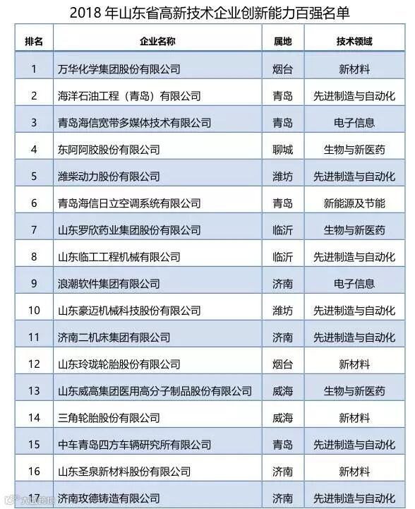 7月9日,山东省科学院情报研究所、山东省科技统计分析研究中心和山东省科技发展战略研究所联合在济南举行2018年山东省高新技术企业创新能力百强发布会,向社会发布了山东省高新技术企业创新能力100强企业名单。