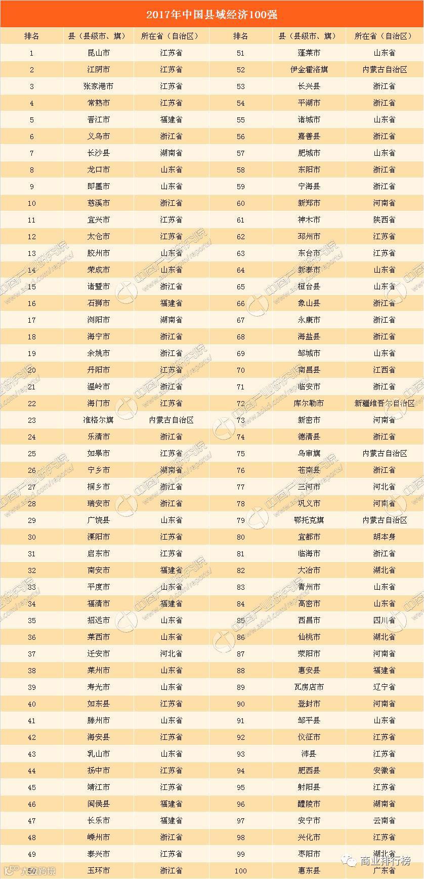 榜单显示:浙江、江苏、山东三省表现最为抢眼,分别占23席、22席和21席,占据了百强县的六成以上。排在前十位的依次是:昆山市、江阴市、张家港市、常熟市、晋江市、义乌市、长沙县、龙口市、即墨市、慈溪市。东部地区占76席,中部地区15席、西部地区8席,东北地区仅占1席。整体呈现,“东多西少、强省强县”的分布格局。