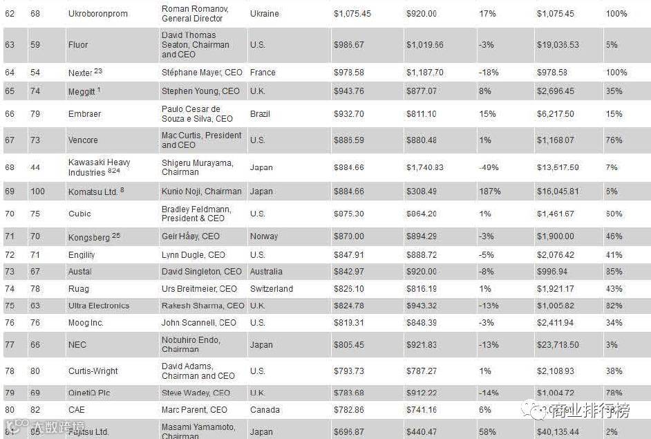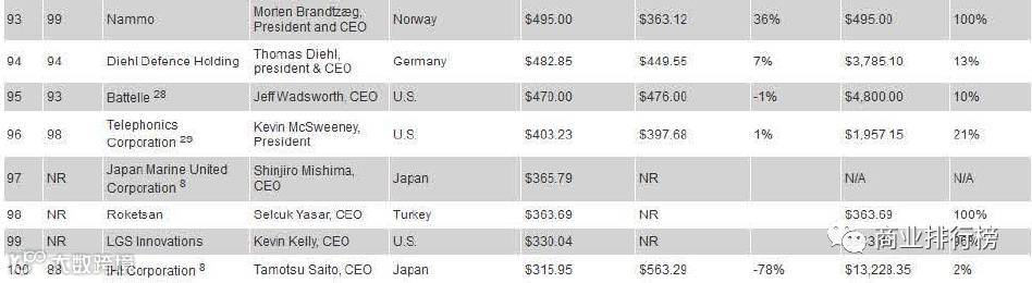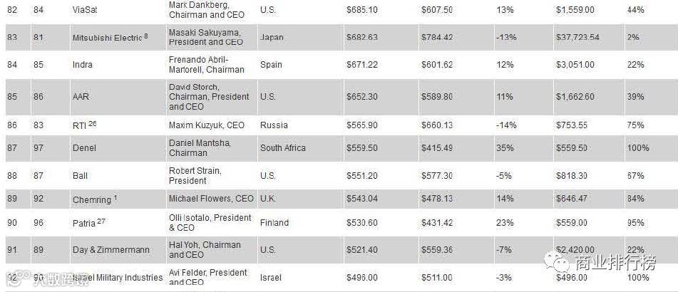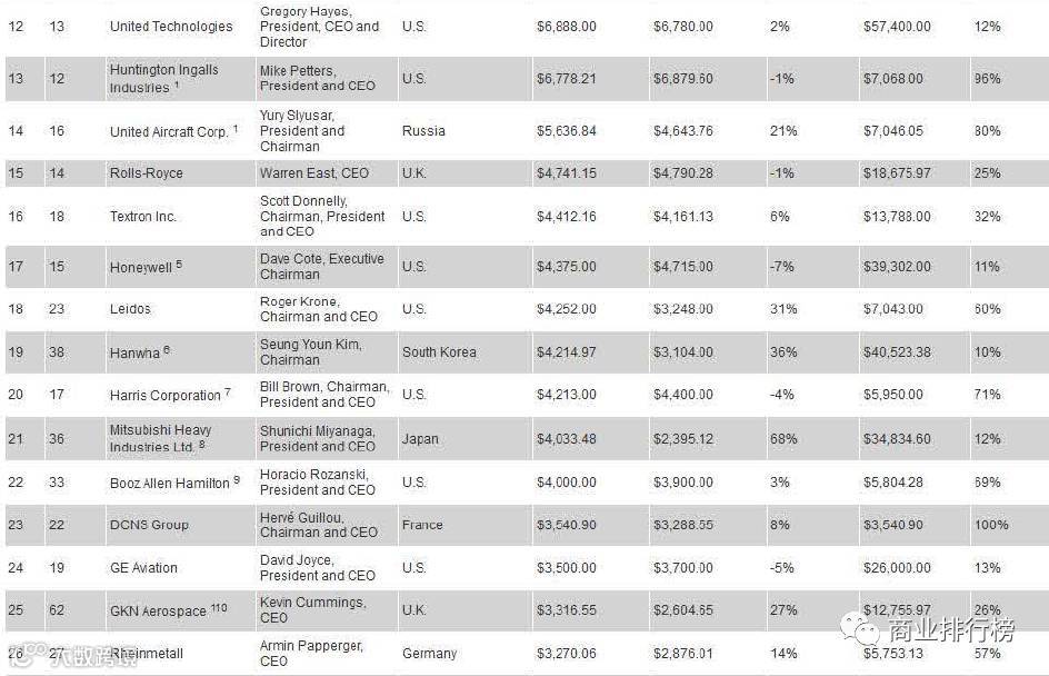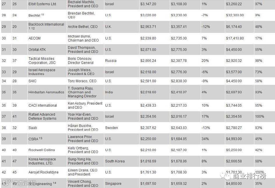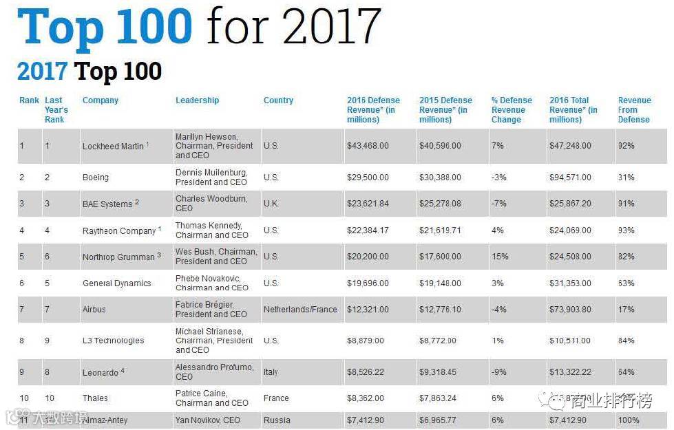 日前,美国《防务新闻》网站发布了2017年世界百强军工企业排行榜。据榜单显示,美国的LockheedMartin(洛克希德?马丁公司)以434.68亿美元位居第一。此次入榜的全球百强军工企业2016年的防务总收入为3650.45亿美元,较去年上涨了2.35%。2017世界百强军工企业排行榜的入围门槛为3.16亿美元,较去年上升了0.8亿美元,上涨了2.6%。