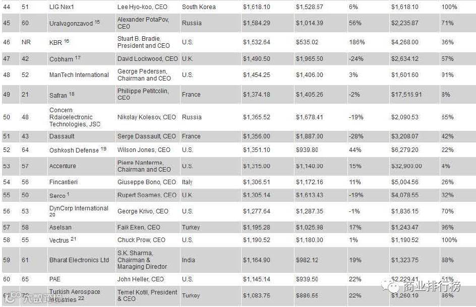 据榜单显示,此次上榜企业中,美国和欧洲军工企业占大比例,上榜数量达72家。其中,洛克希德?马丁公司以434.68亿美元排名第一。排名前十的企业中,美国企业占据前六位;总榜单中,美国共有42家企业入围,防务总收入达2207.1亿美元,占上榜企业防务总收入的60.5%。