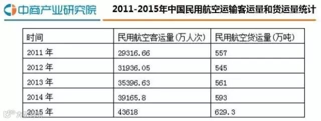 2015年,中国民用航空运输完成客运量4.36亿人次,货运量629.3万吨。