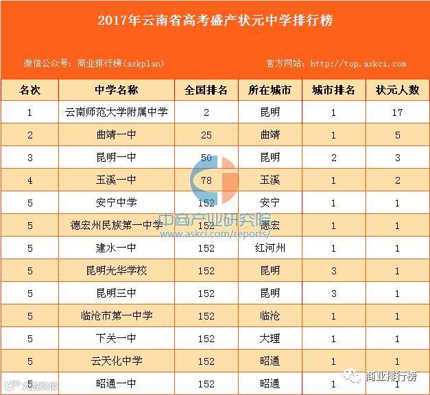 在艾瑞深中国校友会网2017中国顶尖中学排行榜400强中,云南师范大学附属中学、曲靖一中、昆明一中、玉溪一中、安宁中学等名列校友会2017云南省顶尖中学排行榜前5强,也是高考状元最多的中学。