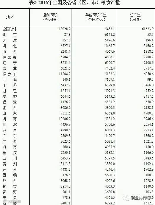 据国家统计局发布的数据显示,2016年全国粮食总产量为61623.9万吨,播种面积为113028.2千公顷。在全国粮食产量排名上,黑龙江省粮食产量超6000万吨居全国之首。紧随其后的是河南省(5946.6万吨)和山东省(4700.7万吨)。