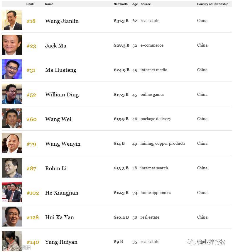 其中,上榜的不乏中国富豪,榜单显示,王健林位以310亿美元的财富值位居福布斯中国富豪榜首,马云以283亿美元的财富值位排名第二,排在第三位的是马化腾,财富值达249亿美元。