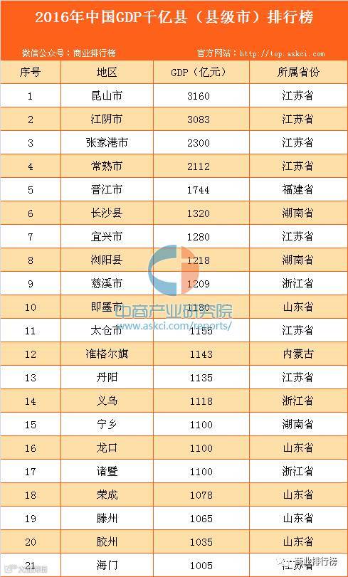招商资源库随着经济的不断增长,目前我国不少县域经济增速迅猛。截至2016年,已有21个县(县级市)的GDP突破了千亿大关,数量上比上年增加2个,分布在江苏、山东、浙江、福建、湖南、内蒙古这6个省份,其中有17个位于沿海地区。分省份看,江苏一省就占据了8个,山东紧随其后,共有5个,浙江有3个,福建1个。经济第一大省广东则无县入围。