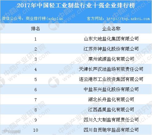 据了解,参评企业是依据2017年度主营业务收入、利润总额、主营业务收入利润率及主营业务收入增速四项指标进行统一评价打分,部分行业在评价中增加了能够反应行业特征的指标项。2017年中国轻工业制盐行业十强企业排行榜如下: