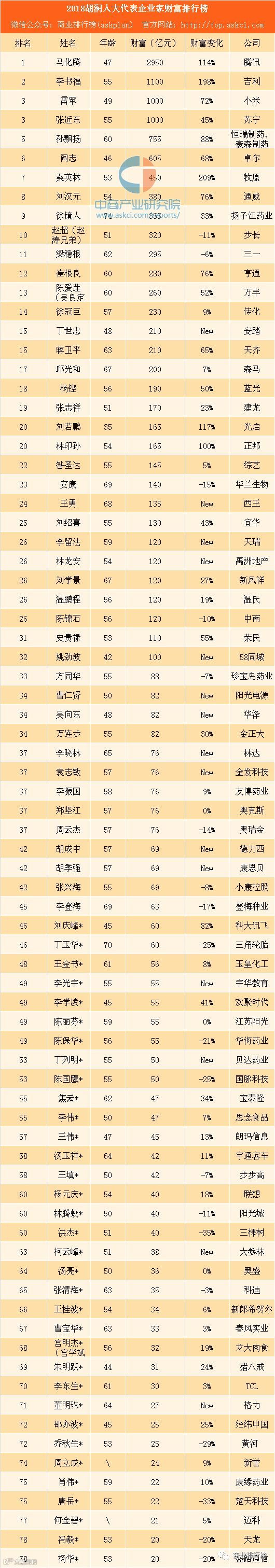 上榜全国人大代表企业家平均年龄56岁,比百富榜的54岁大2岁。平均财富为189亿元。其中马化腾财富最多,共计2950亿元,吉利李书福排名第二,财富共计1100亿元。小米雷军和苏宁张近东排名第三,财富均为1000亿元。此外,47名人大代表企业家财富不足100亿元,其中天龙冯毅和盛路通信杨华财富最少,仅为20亿元。