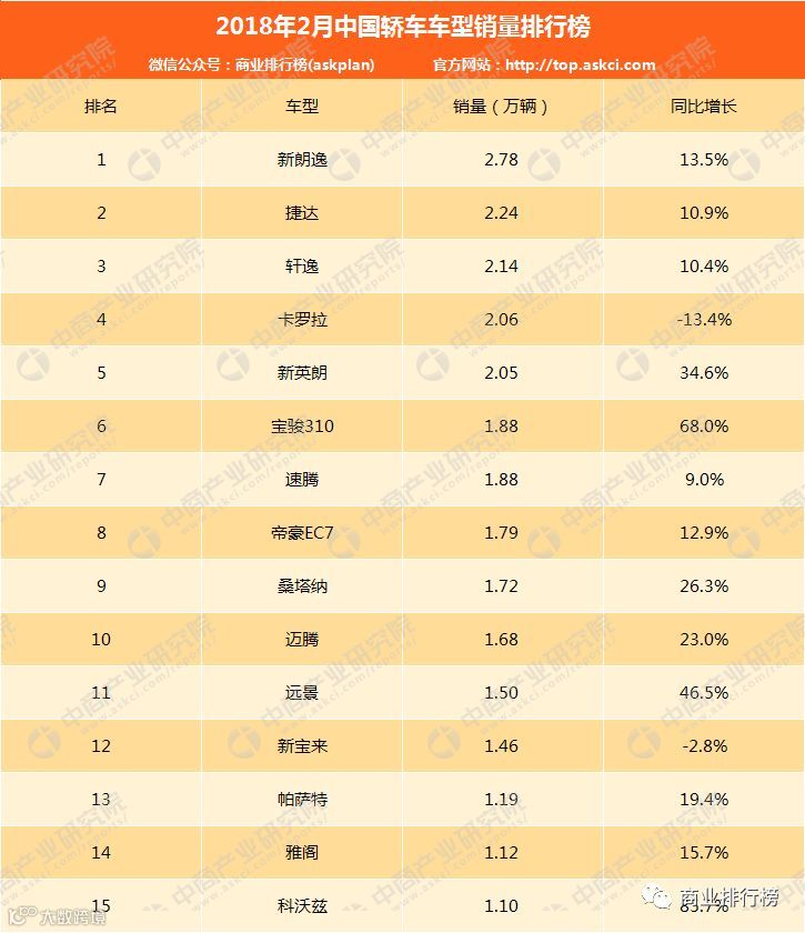 2018年2月轿车车型销量排名中,新朗逸销量第一,2018年2月销量为2.78万辆,同比增长13.5%。以下为具体排名: