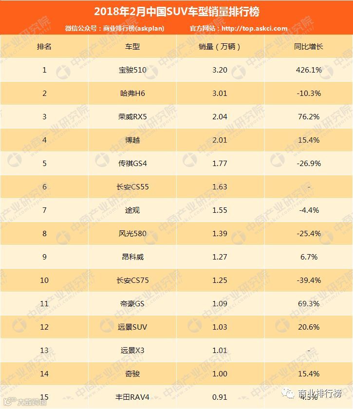 2018年2月SUV车型销量排名中,宝骏510跃居第一,2018年2月销量为3.2万辆,同比激增426.1%。以下为具体排名: