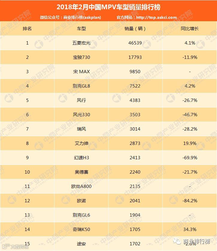 2018年2月MPV车型销量排名中,五菱宏光稳居第一,2018年2月销量为4.65万辆,同比增长4.1%。以下为具体排名: