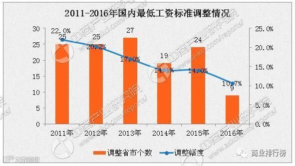 2016年,全国共有北京、上海、天津、重庆、河北、山东、江苏、辽宁和海南等9个省提高了最低工资标准,平均增幅10.7%。从历史数据还看,最低工资增幅不断下降。