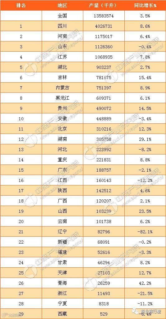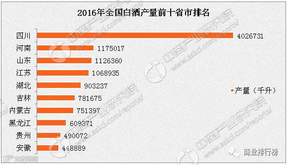 从产量数据来看,2016年全国白酒产量前十个省市分别是四川、河南、山东、江苏、湖北、吉林、内蒙古、黑龙江、贵州和安徽。