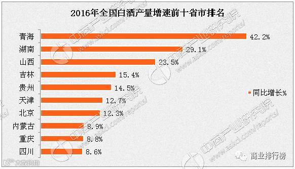 从产量增速来看来看,2016年全国白酒产量前十个省市分别是青海、湖南、山西、吉林、贵州、天津、北京、内蒙古、重庆和四川。其中,青海2016年白酒产量同比增幅高达42.2%,成为全国白酒产量增速最快的省份。其次是湖南省,接近3成。具体产量如下图。