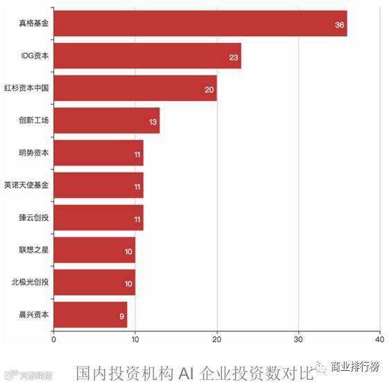 上图统计了国内各家投资机构投资的人工智能企业数量,徐小平创立的真格基金领跑AI领域,总投资数量36笔,超过IDG资本投资总数的1.5倍;IDG、红杉资本中国则分别以总数23/20笔位居第二、第三。