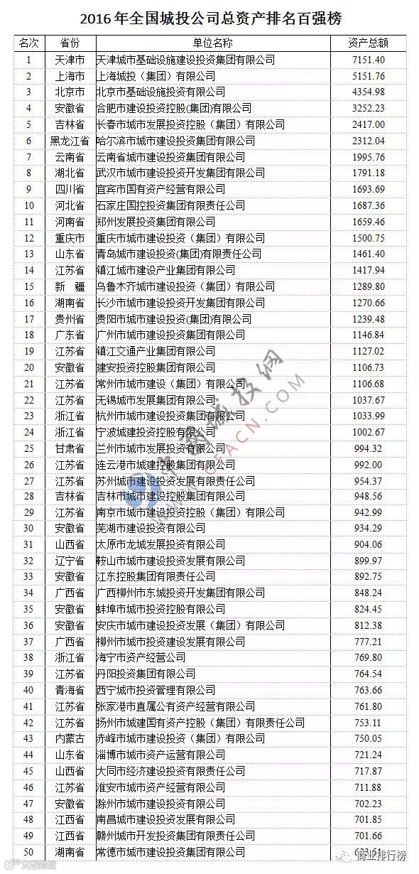 此次排名中,天津城市基础设施建设投资集团有限公司以7151亿元的资产总额高居榜首,第二名是上海城投有限公司,第三名是北京市基础设施投资有限公司,前三名依旧延续上一年的排名,这三家公司的总资产规模为16658亿元,占到本次统计的全国城投企业总资产的17.38%。