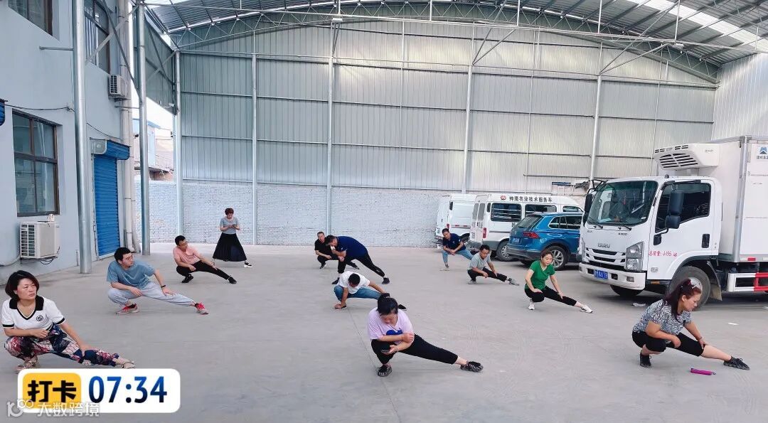 早上7点30分 年轻的神鹰团队在一起拉伸运动