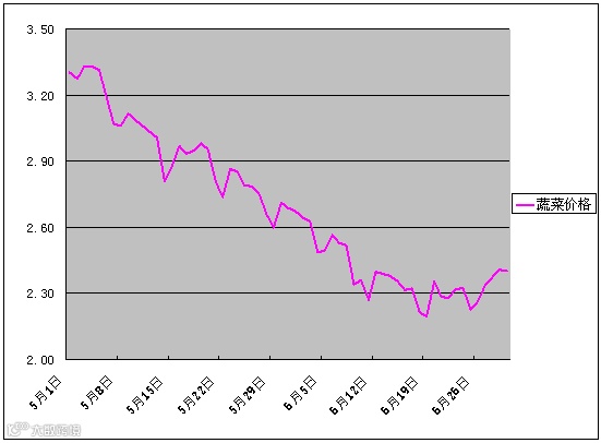 6月份,北方地区的气象条件适宜蔬菜生长上市,蔬菜批发均价继续全面快速回落,菜价继续探底,目前菜价处于今年低位。