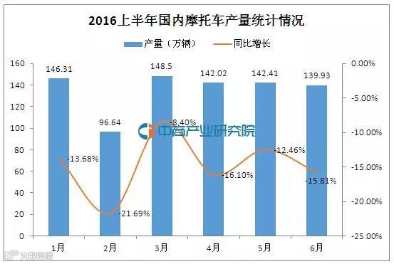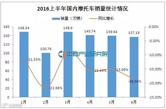 中商情报网讯,据中国汽车工业协会统计分析,2016年6月,摩托车产销继续走低,当月产销量均不足140万辆,环比和同比下降;上半年,全行业累计产销816.38万辆和815.77万辆,同比降幅超14%,降幅继续扩大。