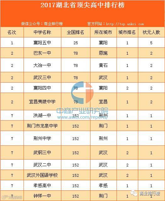 根据榜单显示,在2007-2016年期间,湖北省最盛产高考状元的高中是襄阳五中,在全国排名第25位,共产出5位状元。其次是湖北恩施的巴东一中、大冶一中、武汉三中、襄阳四中、宜昌夷陵中学,高考状元2名。令人遗憾的是,被誉为“孕育英才的基地”、“培养国手的摇篮”的黄冈中学,近十年来居然没有出过一位状元!