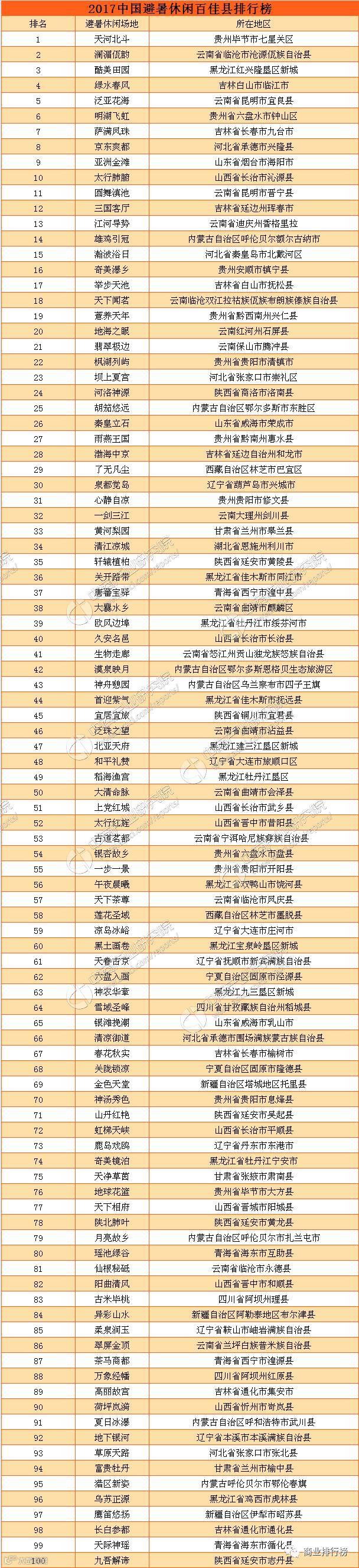 2017中国避暑休闲百佳县排名如下: