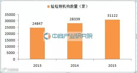 据质监总局数据发布的《2015年度检验检测统计发布信息》数据显示:从机构数量看,截至2015年底,全国各类检验检测机构共计31122家,较2014年度增长9.82%,近三年年均增长11.92%。