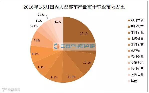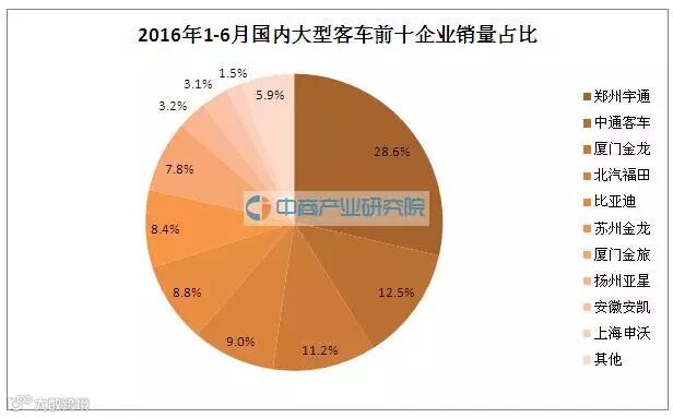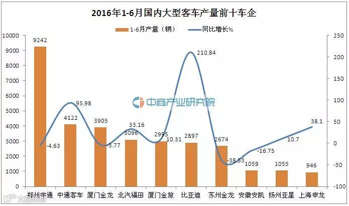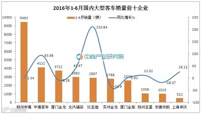 2016年1-6月国内大型客车车(含非完整车辆)销量为33088辆,同比增长4.1%。其中销量排名前十的企业分别是郑州宇通、中通客车、厦门金龙联合、北汽福田、比亚迪、苏州金龙联合、厦门金旅、扬州亚星、安徽安凯以及上海申沃。