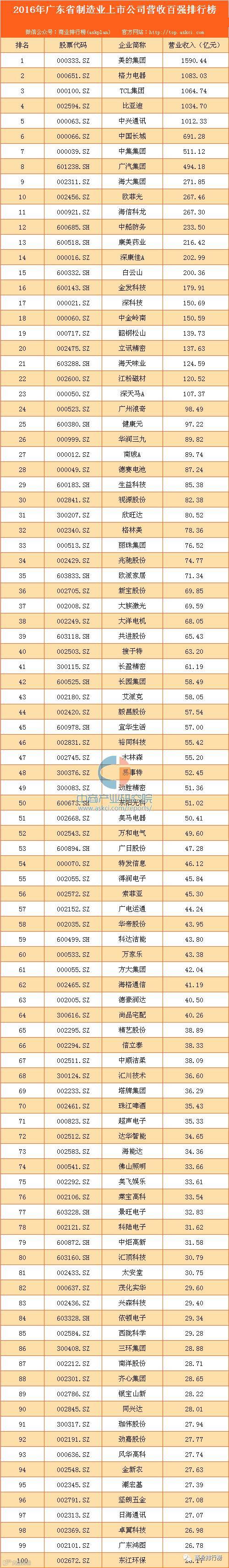 近日,广东省A股上市公司共有513家已经披露完2016年年报,其中制造业为340家。中商产业研究院据此梳理出2016年广东省制造业A股企业营收百强排行榜。根据榜单显示,营收过千亿的企业有5家,100-999亿的企业有18家,低于100亿的有77家,上榜门槛为26.17亿元。