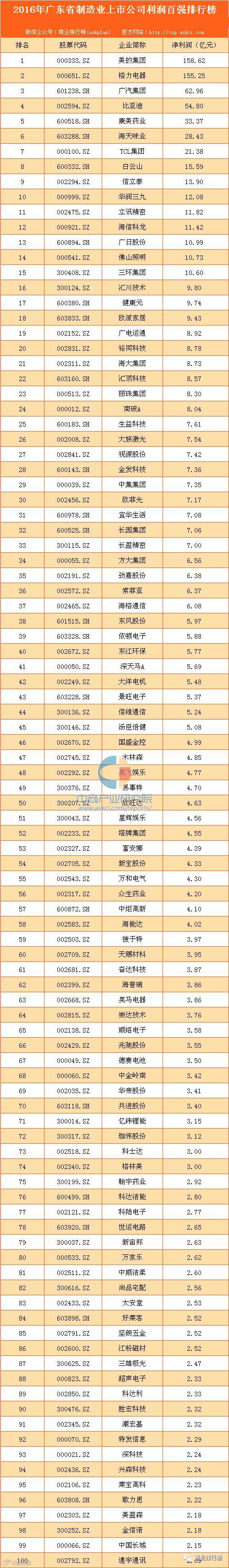 根据榜单显示,利润过百亿的企业有2家,10-99亿的企业有13家,上榜门槛为2.09亿元。榜单前三依次是美的集团、格力电器、广汽集团,净利润分别是158.62亿元、155.25亿元、62.96亿元。值得一提的是,美的2016年营收、净利润、现金分红金额均创下整体上市以来最高。美的2016年营收实现1590.44亿元,同比增长14.88%亿元,同时,美的2016年度拟向全体股东每10股派发现金红利10元(含税),现金分红金额(含税)为64.66亿元。高业绩也支撑美的市值年内增长34%,首次突破2000亿元大关。