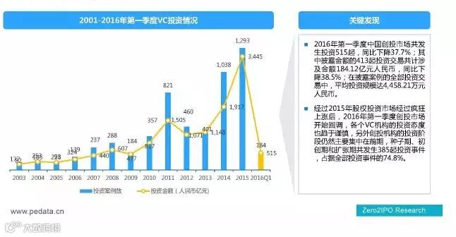 2016年一季度中国创投市场共发生投资515起,投资放缓,投资金额同比下降38.5%。