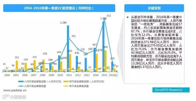 2016年一季度创投市场新增募集其中人民币基金57支,占全部新募集数量的87.7%;人民币募资活跃度仍持续领先。