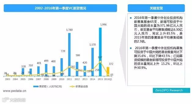 可投资于中国大陆的基金数量同比下降35.6%。中国VC基金平均募集金额环比提升。据清科研究中心统计:2016年一季度中外创投机构新募集基金65支,同比增长85.5%。