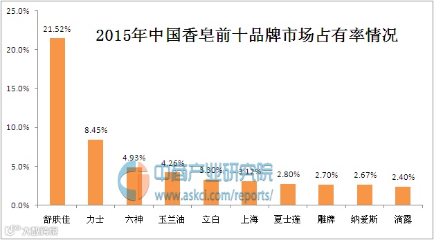 中商产业研究院发布的《2017-2022年中国香皂行业市场调查及投资前景研究报告》指出,2015年,我国香皂行业市场份额排名前十品牌分别为:舒肤佳、力士、六神、玉兰油、立白、上海、夏士莲、雕牌、纳爱斯和滴露。从品牌监测情况来看,舒肤佳、力士和六神为最热销的三大品牌,香皂市场前十品牌市场占有率达56%左右,市场集中度较高。
