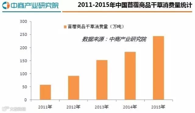 根据近几年苜蓿商品干草产量及进口量数据显示,我国苜蓿草的需求,进口量占一半,国内生产量占一半。2015年苜蓿商品干草产量123万吨,进口苜蓿121万吨,所以我国苜蓿商品干草消费量为244万吨左右。