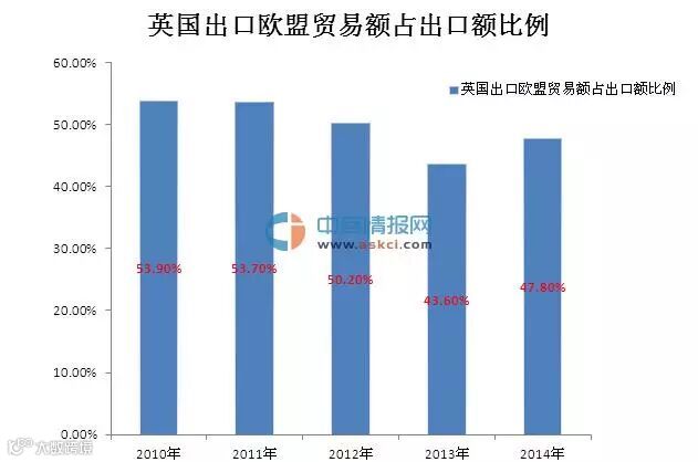据中商产业研究院资料统计,2010年-2014年英国出口欧盟的贸易额占英国对外贸易出口总额的比例维持在50%左右。