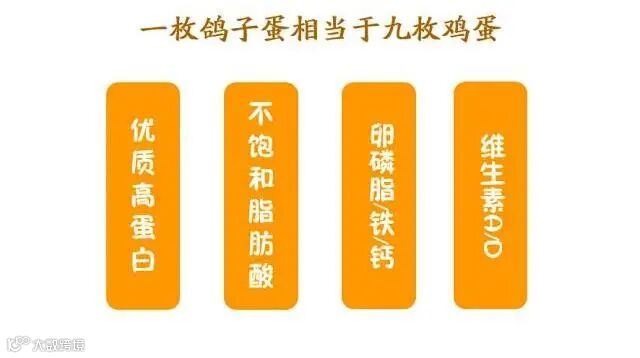鸽子蛋含有大量优质蛋白质及少量脂肪、并含少量糖分,磷脂、铁、钙、维生素A、维生素B1、维生素D等营养成分,易于消化吸收,因此也被称为“动物人参”。