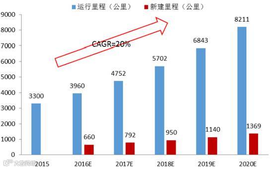 预计“十三五”期间我国轨道交通新建里程有望达到5000公里,年复合增速超过20%。