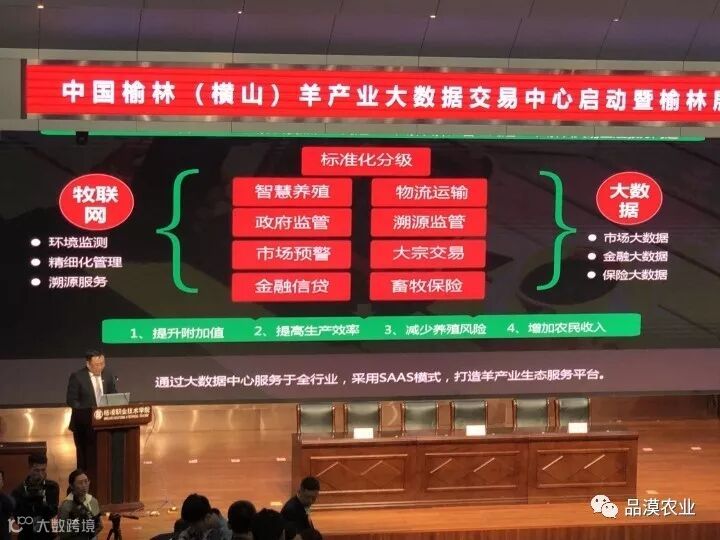 中国榆林(横山)羊产业大数据交易中心由榆林市科技局、横山区政府和陕西品漠农牧科技发展有限公司共同筹建, 羊产业交易中心将生根榆林、覆盖西北、面向全国、贯通丝路"为使命,探索创建全新的羊产品现货交易市场模式,建立运作规范、具有公信力的一整套完整 的市场准入标准和产品交易规则.通过羊产品交易中心降低交易管理成本、构建规范透明交易规则、树立相关交易商品口碑和品牌建设的制度体系,并通过羊产品交易、创新金融、衍生产品等板块的发展,推动"羊产业电子交易平台"和“互联网+羊产业"发展。
