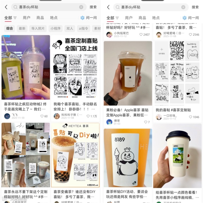 再升级一步,就是给你工具,你自己玩喜茶的DIY杯贴是这类的典范。品牌不用自己绞尽脑汁想梗,只需在小程序里开放一个自定义入口,提供简单的模板。