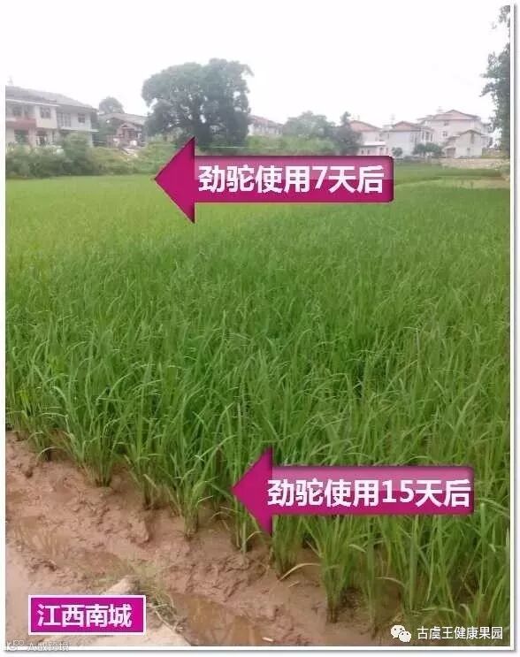 故事:江西南城县徐家乡有一个零售商,他的店门口就有块僵苗田,因为这块田附近有个化工厂,每到下大雨的天气,污水就会漫到田里,水稻就长不起来,尝试了多种办法,往年也追过各种肥料,都不见效,基本上放弃了,这个老板很没面子,他说,我干农资这么多年,卖了这么多年肥料,一个僵苗硬是解决不了,后来我们的经销商去布点,跟他讲劲驼肥料生根特别好,可以抗僵苗。他将信将疑,就搞了一包劲驼,追了其中一块田,7天之后水稻竟然就长起来了,长势明显好转,他非常激动,又把左边那块田也追了,一周之后也长起来了,所以后来拍照的时候,右边这块田是15天后的长势,左边这块刚好是7天。