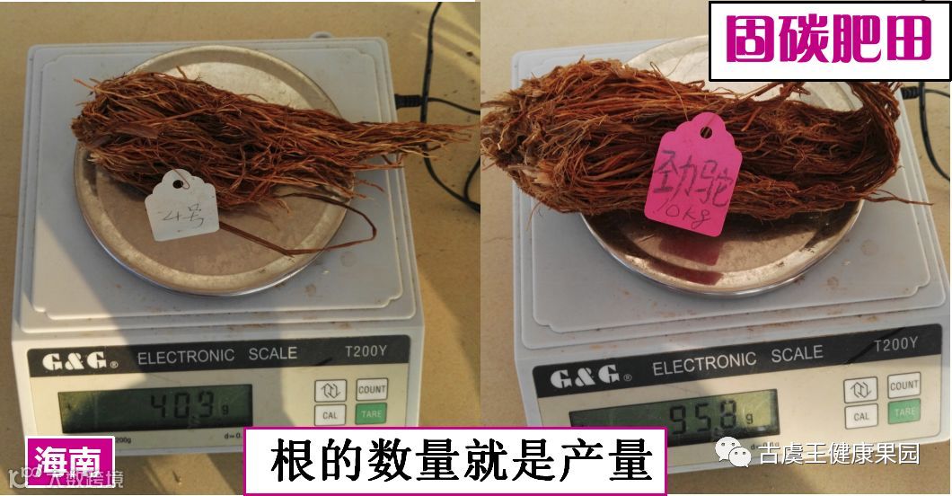 故事:这两幅图是海南大学的高教授给我们做的劲驼直播田试验,在水稻勾头的时候,他挖了两株水稻根,洗干净,然后晾晒,放到称上称,用劲驼的水稻根比常规的多出1两多,他说假如我们按照一亩地18000株来算,一亩地就多出的2000斤的根,他说你不要小看这2000斤的根,这2000斤的根你拖不走、带不走,他只会烂在田里,这就是不要钱的农家肥,这就是国家一直提倡的固碳肥田啊。