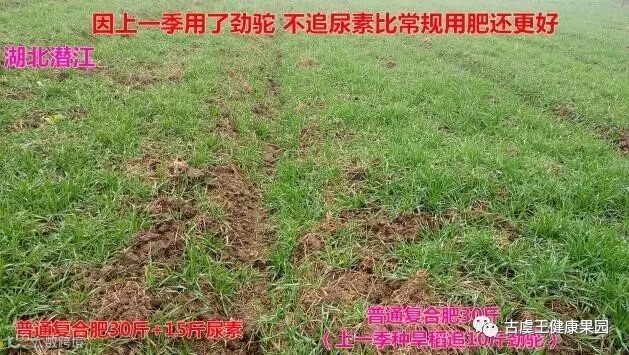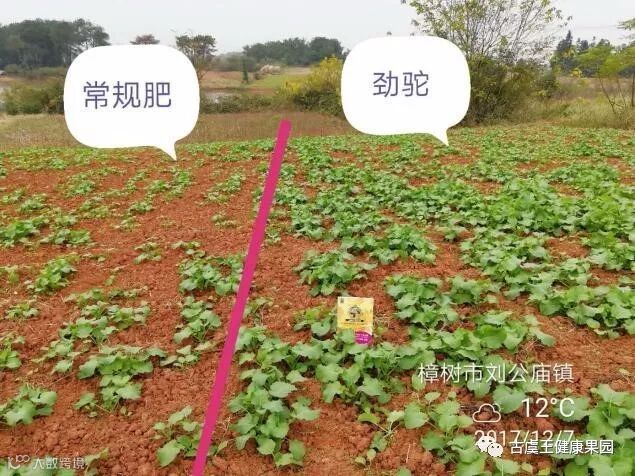 故事:2017年8月湖北潜江农户在旱稻上追劲驼10斤, 下一茬种小麦,由于缺货,就用常规肥料30斤打底,因为长势好,未追任何肥料,对照田常规复合肥30斤打底,追了15斤尿素,长势还不如上一茬用过劲驼的那块田。上一茬使用过劲驼,对下一茬影响依然明显,充分说明劲驼后期肥力足,营养长效120天的功能特点。